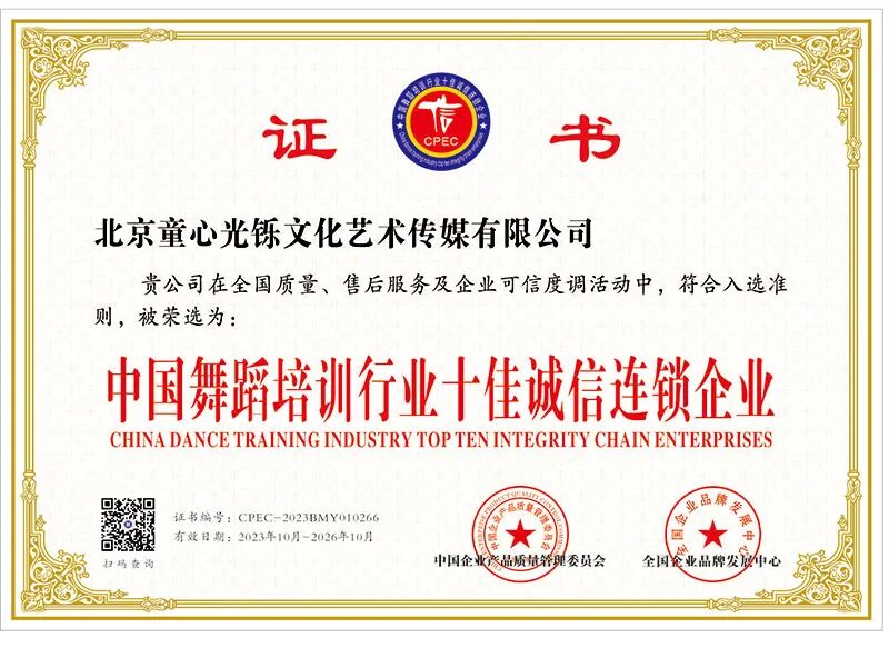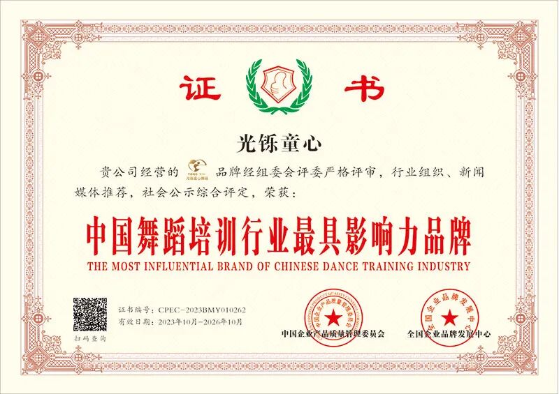 大事件:就在今年,就在10月,就在刚刚,北京光铄童心舞蹈被“中国企业产品质量管理委员会、全国企业品牌发展中心” 授权6项荣誉。